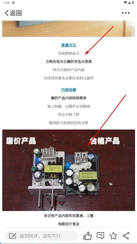 2、阅读文章内容,了解充电头在重量、内部结构等方面的差异,从而获取相关产品知识。
