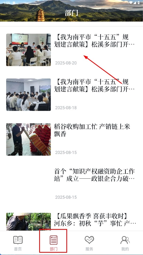 4、点击底部的【部门】选项,进入部门板块查看相关资讯,比如“我为南平市‘十五五’规划建言献策”这类文章,以此了解政务动态。