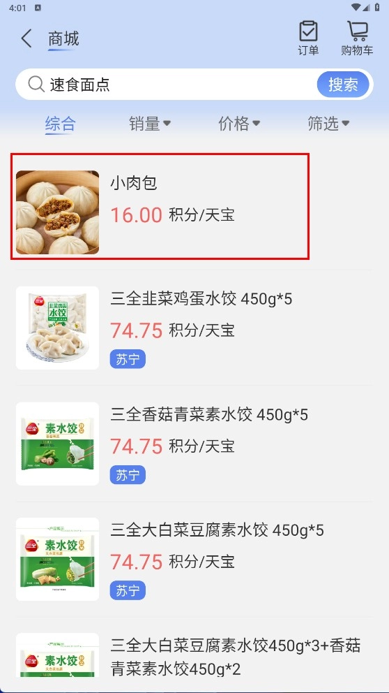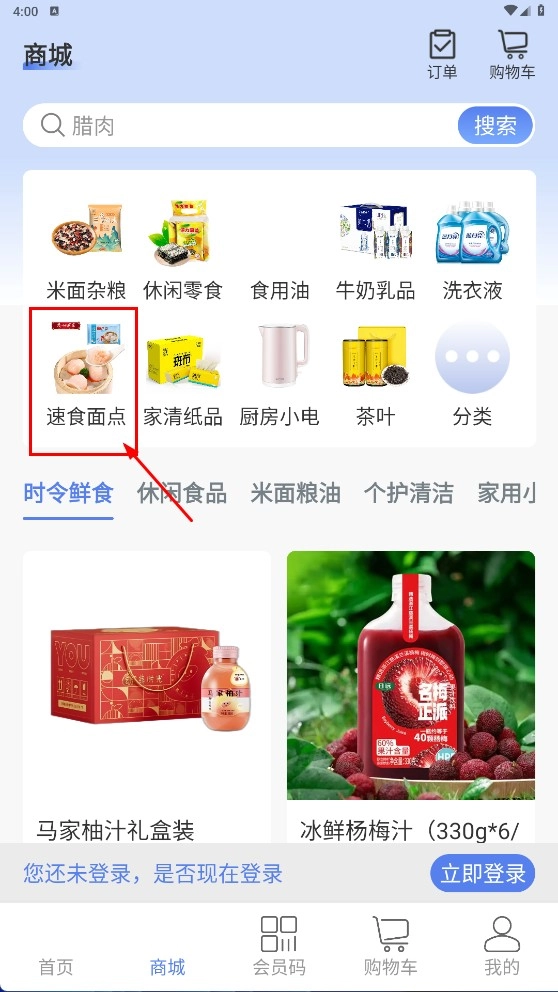 2、在商城界面,点击【速食面点】分类,进入速食面点商品列表。