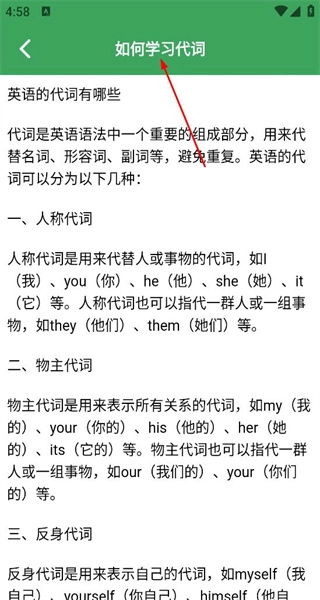 4、再次回到学习资讯页面,点击“如何学习代词”进入详情页,了解代词的不同类型,掌握各类代词的具体使用方法。
