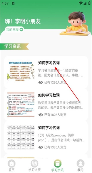 打开软件进入首页后,能看到“我的日程”板块和“学习资讯”区域,点击“如何学习名词”,即可进入该语法内容的详情页面。