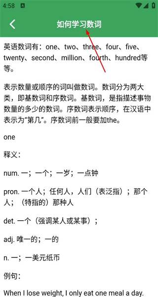 3、回到学习资讯页面,点击“如何学习数词”,进入详情页后,查看数词的分类,以及相关词汇的释义和例句内容。