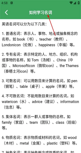 2、在学习名词的详情页面,能看到英语名词的分类介绍,涵盖普通、专有、可数等类别,还能了解各类名词的学习要点。