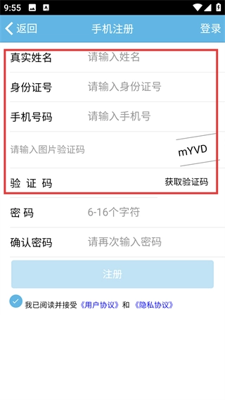 2、在注册页面按顺序填写真实姓名、身份证号、手机号码,输入图片验证码后点击“获取验证码”按钮,再填写收到的短信验证码。
