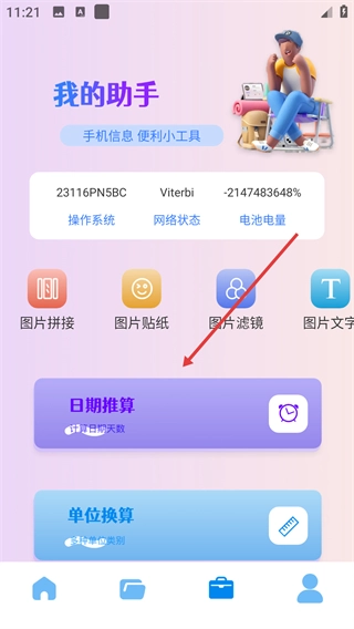 2、进入“我的助手”页面后,点击【日期推算】模块,即可进入日期计算的操作界面。