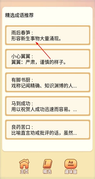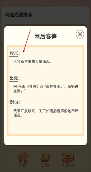 打开软件后,进入精选页面,能看到“雨后春笋”等推荐成语,点击“雨后春笋”,即可进入该成语的详情弹窗页面。