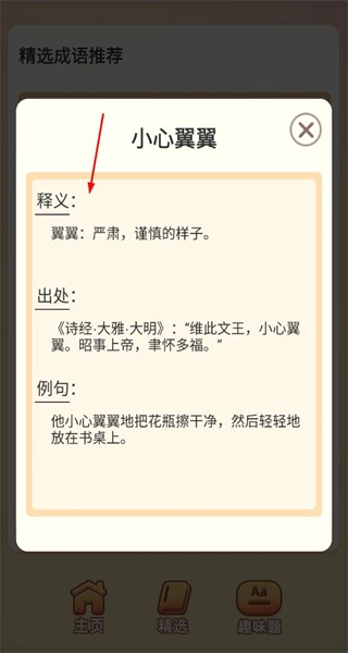 3、回到精选页面,点击“小心翼翼”这个成语,打开对应的详情弹窗,查看它的释义、出处以及例句内容。