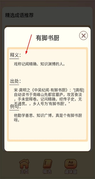 4、再次回到精选页面,点击“有脚书厨”这个成语,打开详情弹窗,查看该成语的释义、出处等相关信息。