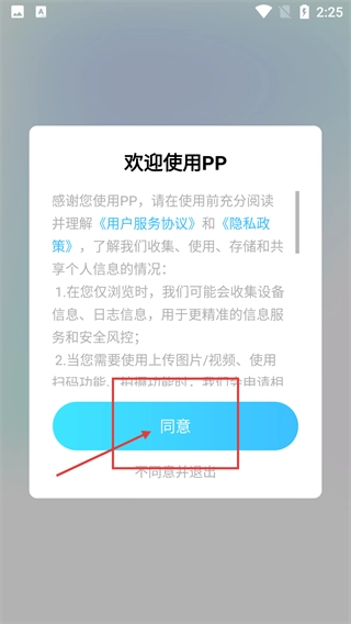 1、进入【PP】的欢迎界面后,仔细阅读【用户服务协议】与【隐私政策】的内容,点击【同意】按钮,就能进入接下来的登录流程。