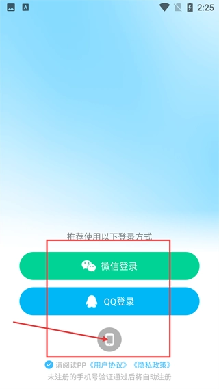 2、登录界面提供【微信登录】和【QQ登录】选项,也可点击下方图标切换至账号登录方式,操作前需先勾选相关协议选项。