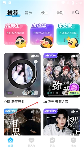 4、登录后进入【推荐】主页,能看到【找男生】-【来点唱】之类的功能入口,还有【心晴-新厅开业】等推荐内容,可根据自身需求参与互动。