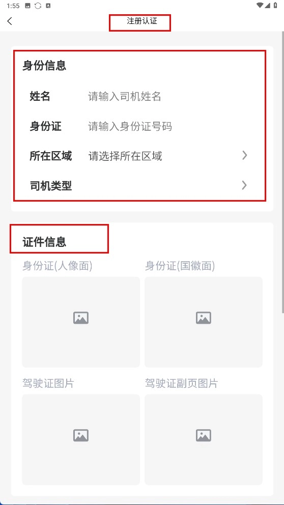 3、进入注册认证页面后,请按顺序填写姓名、身份证号等身份信息,并上传身份证、驾驶证的相关图片。