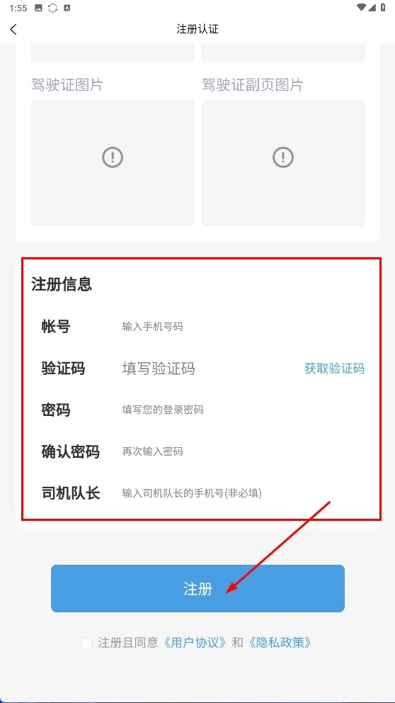 4、填写账号、验证码、密码等注册信息,勾选相关协议后点击【注册】按钮,即可完成司机账号的注册与认证流程。