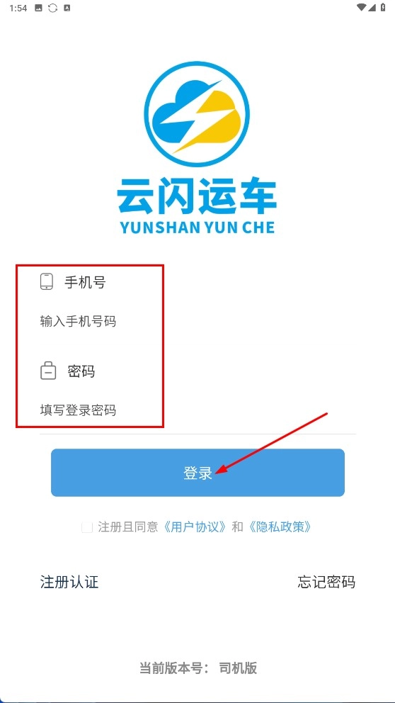 2、进入“云闪运车”登录页面,输入账号和密码,勾选相关协议后点击【登录】按钮,即可完成账号登录操作。