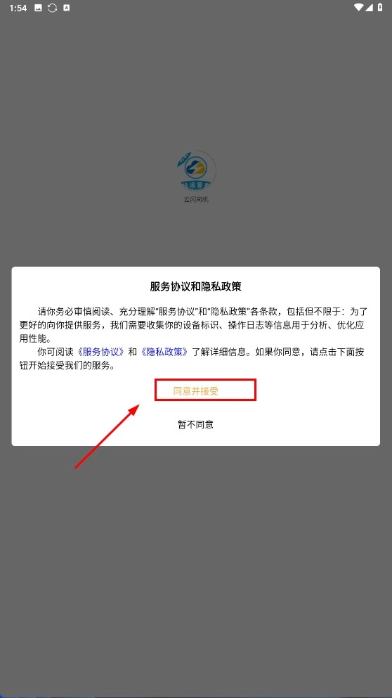 1、当弹出服务协议与隐私政策的窗口时,点击【同意并接受】按钮,确认相关协议条款后,即可进入应用的后续操作流程。