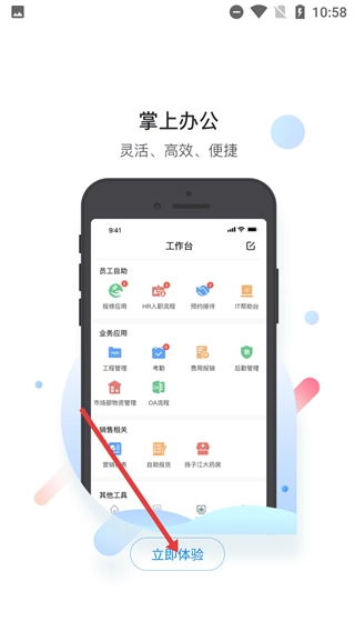 1、在掌上办公引导页,点击【立即体验】按钮,即可进入应用的后续操作流程。