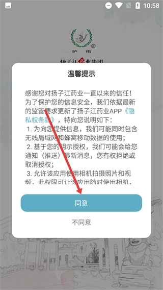2、在温馨提示弹窗里,仔细阅读《隐私权条款》的相关说明后,点击【同意】按钮,即可继续使用该应用。