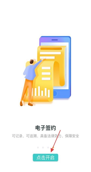 1、打开软件后,进入电子签约引导页面,浏览电子签约的特点,然后点击“开启”按钮进入首页。