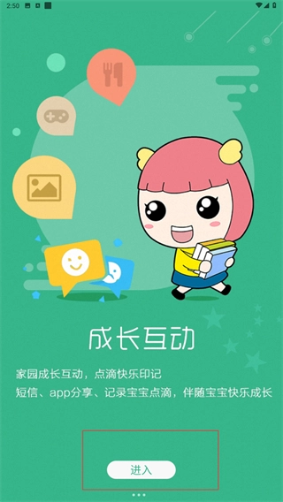 2、在【成长互动】界面,点击【进入】按钮,即可开启家校互动功能,用于记录宝宝的成长过程。