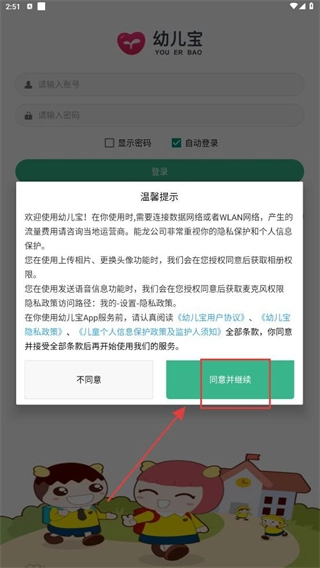 1、第一次打开【幼儿宝】应用时,点击【同意并继续】按钮,确认接受用户协议后,即可进入应用的使用流程。