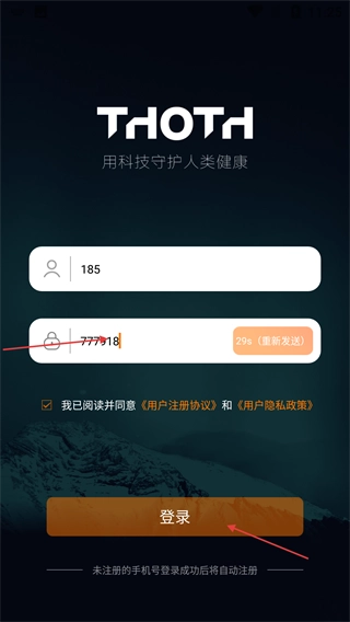 2、填写号码和收到的验证码后,点击【登录】按钮就能进入应用;未注册的号码登录成功后会自动完成注册。