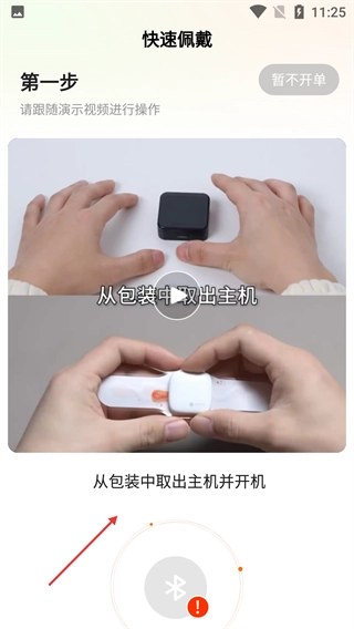 3、进入【快速佩戴】页面后,要跟着演示视频完成第一步操作:把主机从包装里取出来并开机,要是不想现在操作,也可以选择【暂不开单】来跳过这一步。