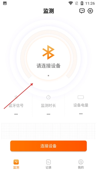 4、进入【监测】页面后,点击【连接设备】按钮,借助蓝牙功能连接对应的设备。连接成功后,就能查看蓝牙信号、监测时长、设备电量等相关信息。