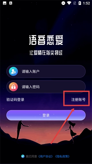 2、进入“语音恋爱”的登录页面后,点击【注册账号】选项,进入账号注册的信息填写界面。