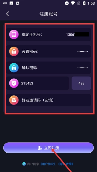 3、进入注册账号页面后,依次填写绑定号、设置并确认密码、输入验证码,随后点击【立即注册】按钮,即可完成账号注册流程。