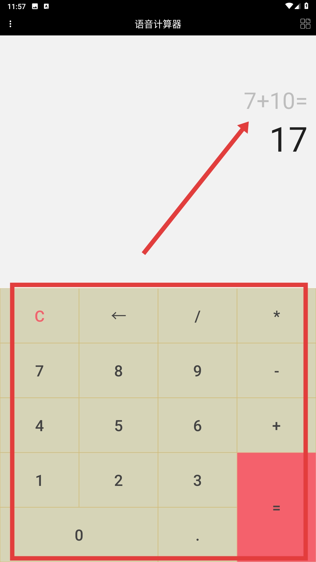1、进入语音计算器界面后,利用数字键和运算符号键输入算式(例如“7+10”),随后点击“=”按钮即可得到计算结果。