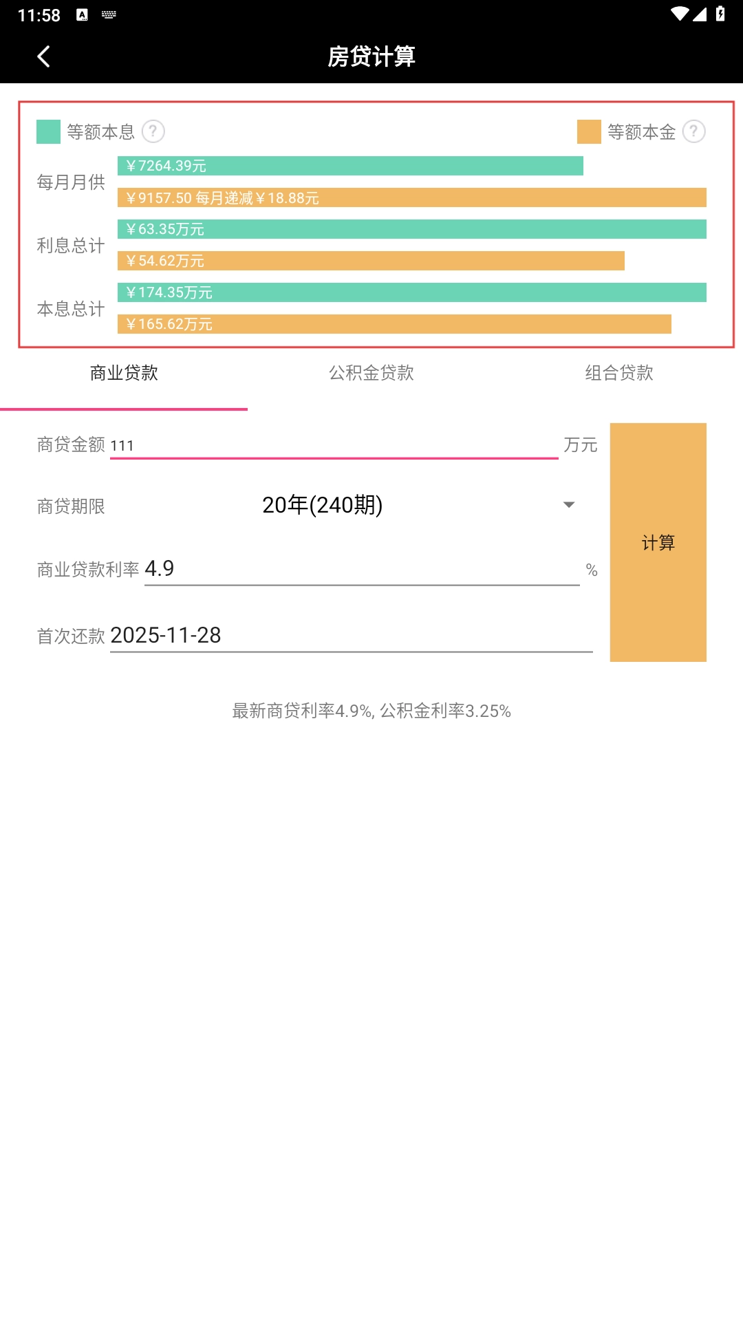 4、查看计算结果,能够对等额本息和等额本金这两种还款方式的月供、利息等数据进行对比。
