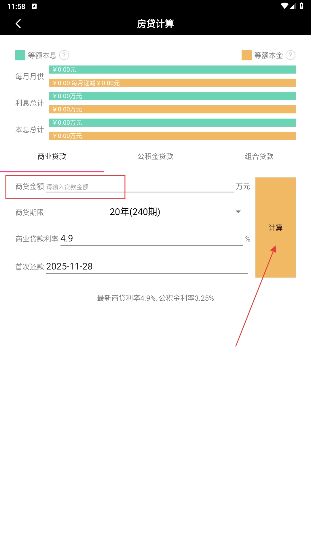 3、进入房贷计算页面后,在【商贷金额输入框】中填写具体的贷款金额,接着确认贷款期限、贷款利率等相关参数无误,最后点击【计算功能按钮】即可。