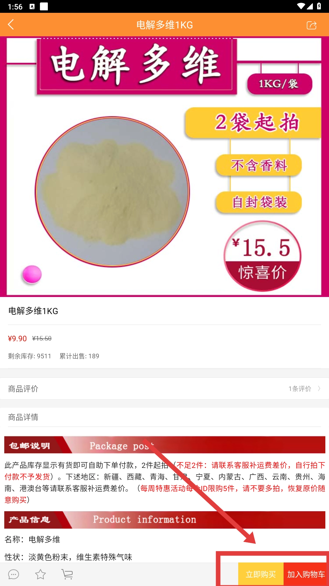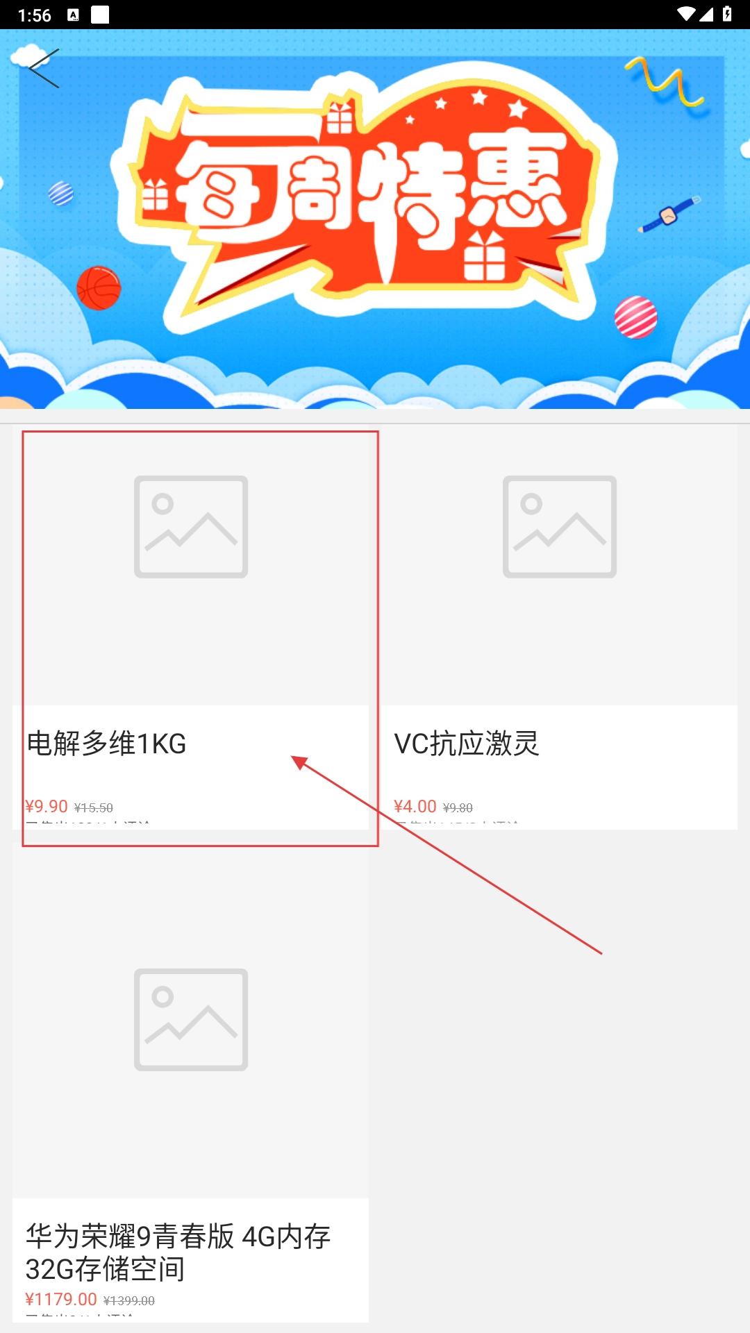 2、在每周特惠页面,挑选目标商品(例如“电解多维1KG”),点击商品卡片进入详情页面。