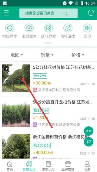 1、在花木网首页,点击底部导航栏的【供应大厅】选项,即可进入花木供应相关的商品展示页面。