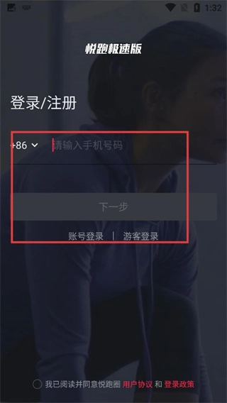 1、在【悦跑极速版】的登录页面,用户既可以填写【号码】通过验证码完成登录,也能选择【账号登录】或者【游客登录】的方式。
