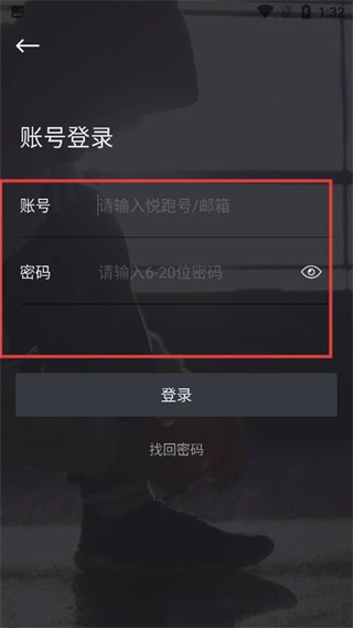 2、进入【账号登录】页面后,要在【账号】栏填写悦跑号或邮箱,【密码】栏填写6-20位的密码,填写完成后点击【登录】按钮就能进入应用了。
