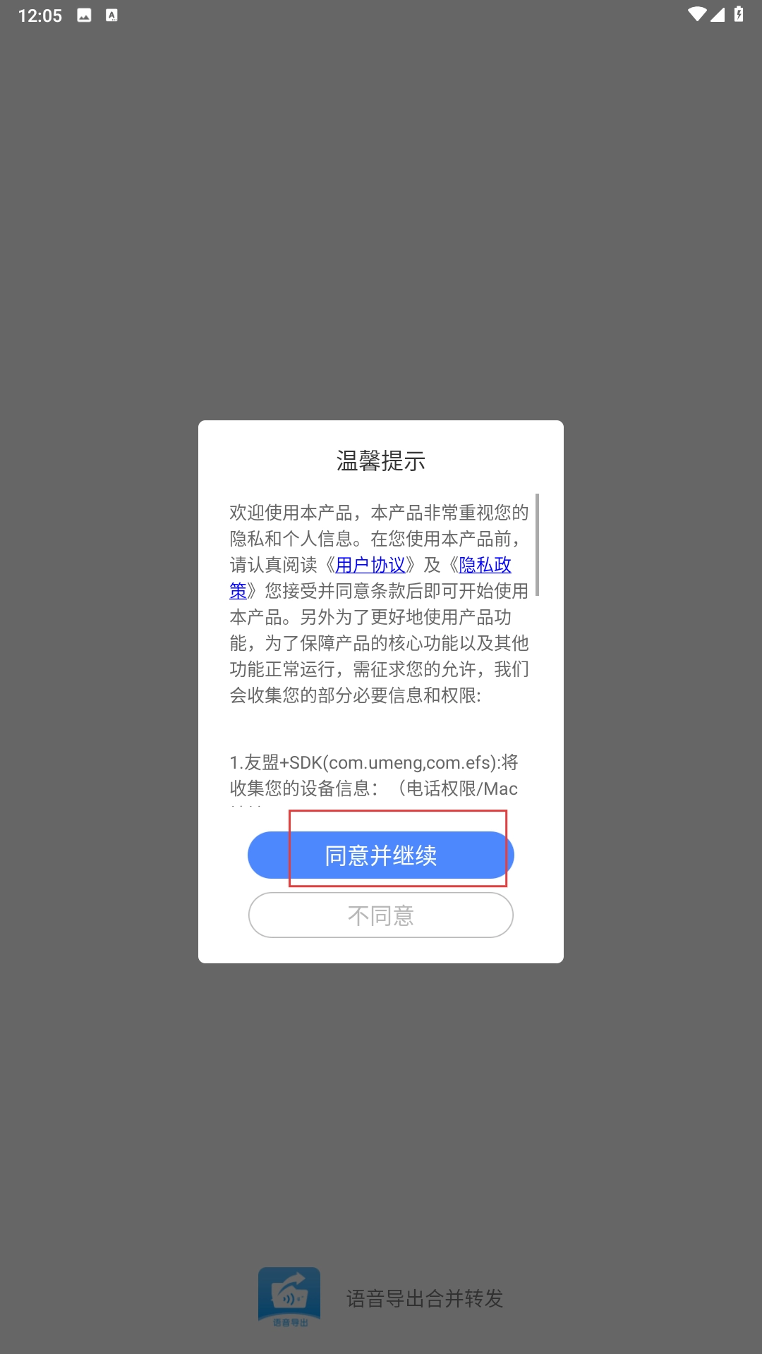 1、当温馨提示弹窗出现时,点击【同意并继续】按钮,以此接受用户协议和隐私政策,从而进入应用。