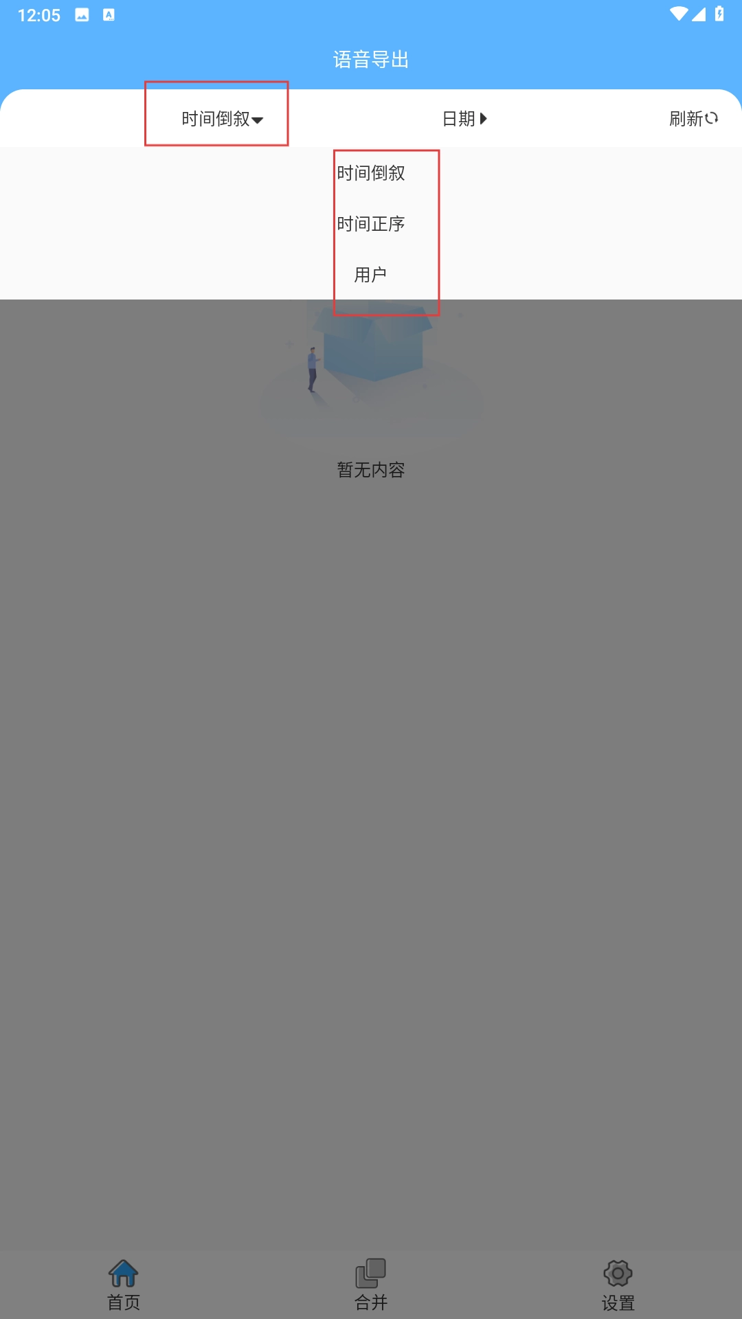 2、进入语音导出页面后,点击【时间倒叙】按钮,即可选择时间倒叙、时间正序、用户等不同的排序方式。