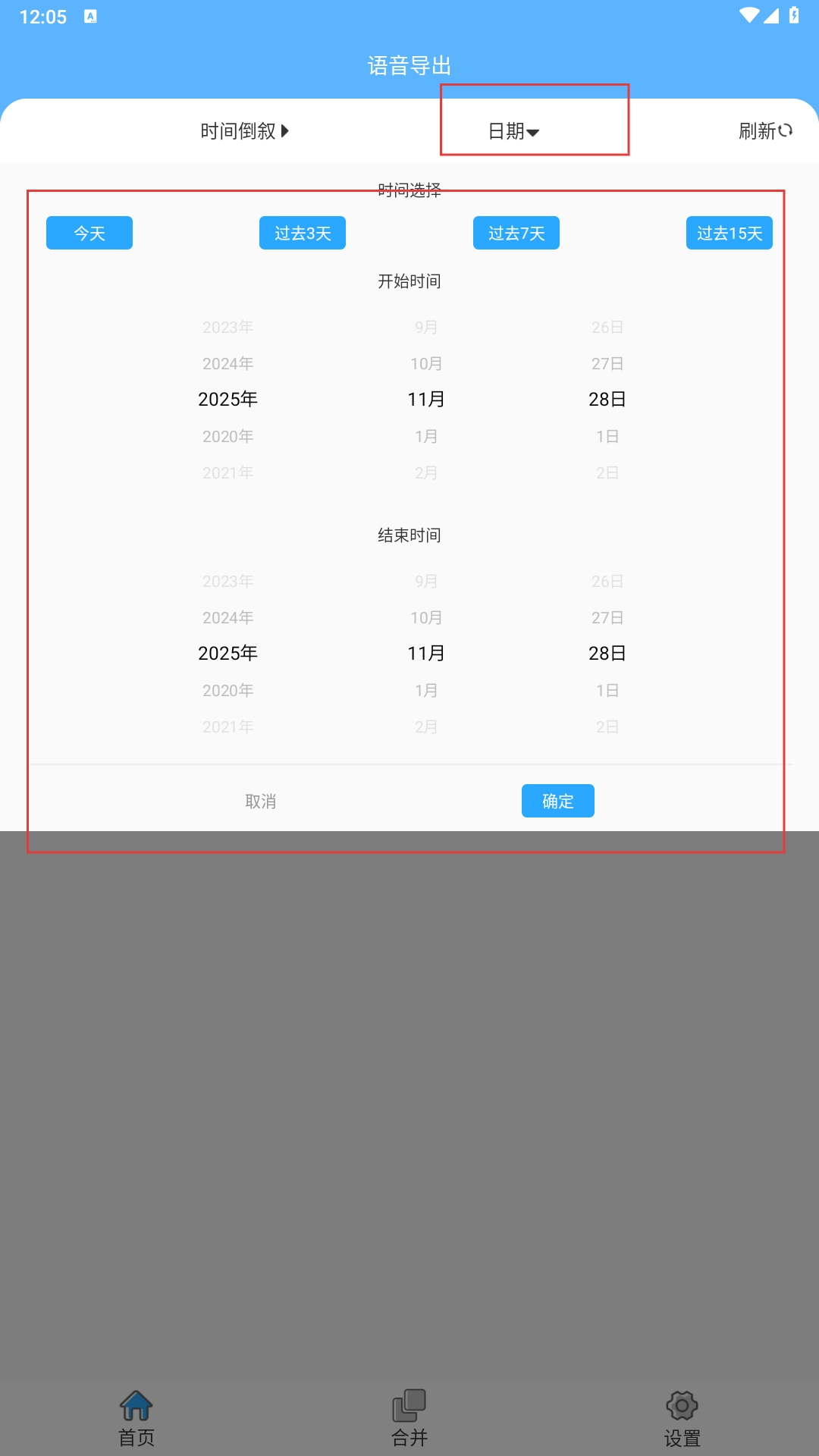 3、点击【日期】选项,进入时间选择界面后,可选择“今天”“过去3天”等快捷选项,也能手动设置开始与结束时间,设置完成后点击【确定】即可筛选出对应内容。