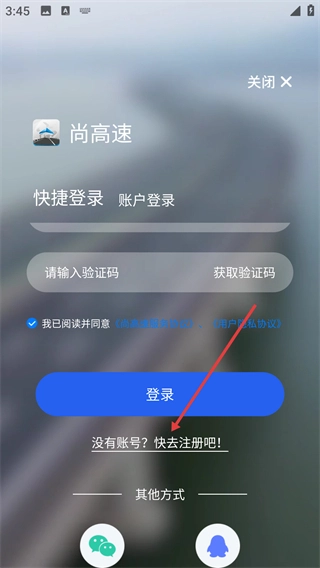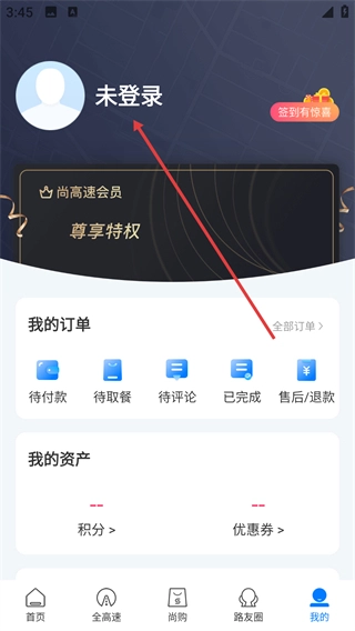 1、在“我的”页面点击【未登录】区域,即可进入尚高速的登录界面,在该界面可选择登录或注册的方式。