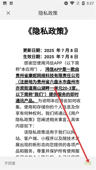 1、在《隐私政策》页面,仔细阅读条款内容后,点击【同意】按钮,即可继续进行应用的后续操作流程。