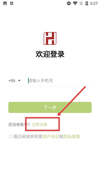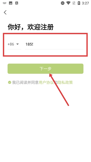 3、在注册页面,填写号码并勾选“我已阅读并同意用户协议和隐私政策”后,点击【下一步】按钮,即可进入注册验证环节。