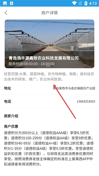 4、在商户详情页面,能够查看商户的经营范围、地址、联系电话以及优惠政策,从而了解该商户所提供的服务内容与相关权益。