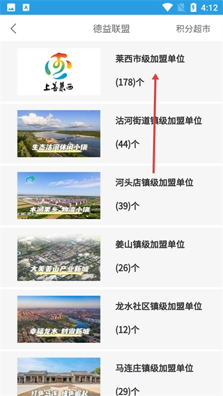 2、在德益联盟页面,挑选目标加盟单位的分类(例如【莱西市级加盟单位】),然后进入与之对应的服务列表。