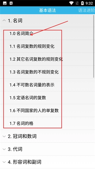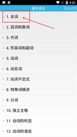 1、进入【基本语法】板块后,会呈现语法知识点的列表,点击【1.名词】就能展开其包含的细分学习内容,大家可以按照模块逐步学习语法知识。