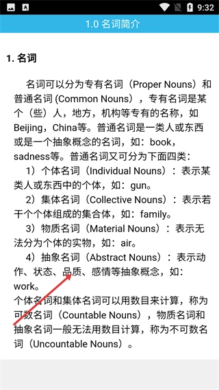 3、进入【1.0名词简介】页面,能够了解名词的分类情况:专有名词和普通名词,其中普通名词还包含个体、集体、物质、抽象这四类。