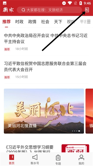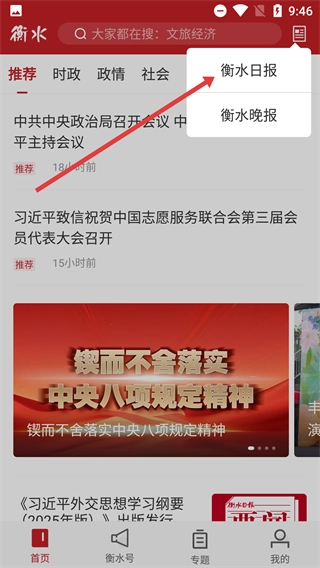 1、在该应用界面中,点击右上角的按钮以展开选项菜单,为后续选择【衡水日报】【衡水晚报】等内容模块做好准备。