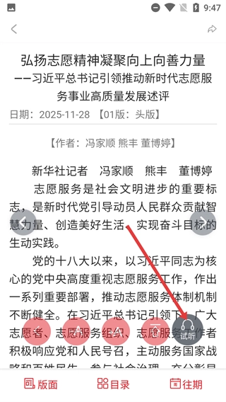 4、在文章详情页,除了查看内容,还能点击【收听】按钮,获取该文章的音频版本,让阅读体验更丰富。