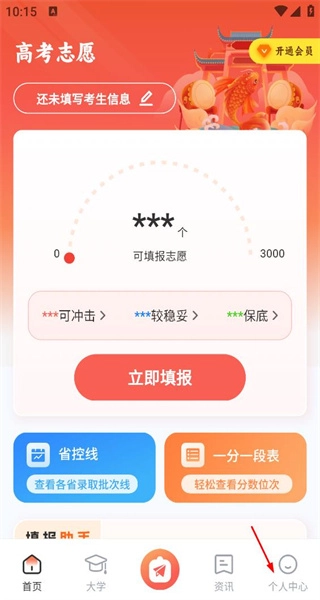 1、打开软件后,留意未填写考生信息的提示,接着点击底部的个人中心按钮,进入个人中心页面。
