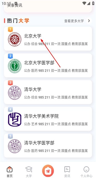 4、进入热门大学页面,浏览展示的高校信息,查看学校属性等内容,点击可查看更多大学。